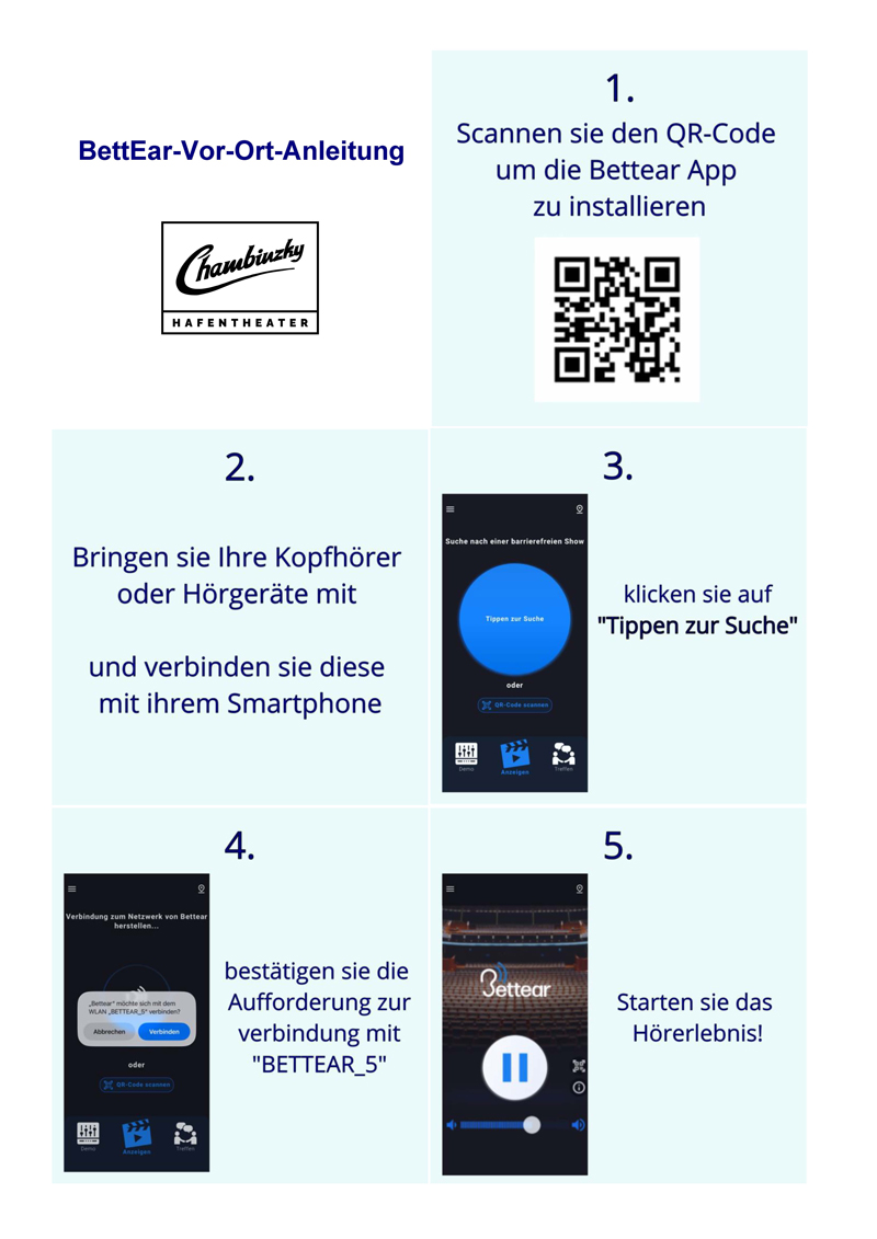 Das Chambinzky Hafentheater im Kulturspeicher verfügt, Dank der freundlichen Unterstützung des Inklusionsbüros der Stadt Würzburg, über ein BettEar-Hörassistenzsystem für den gesamten Theatersaal.